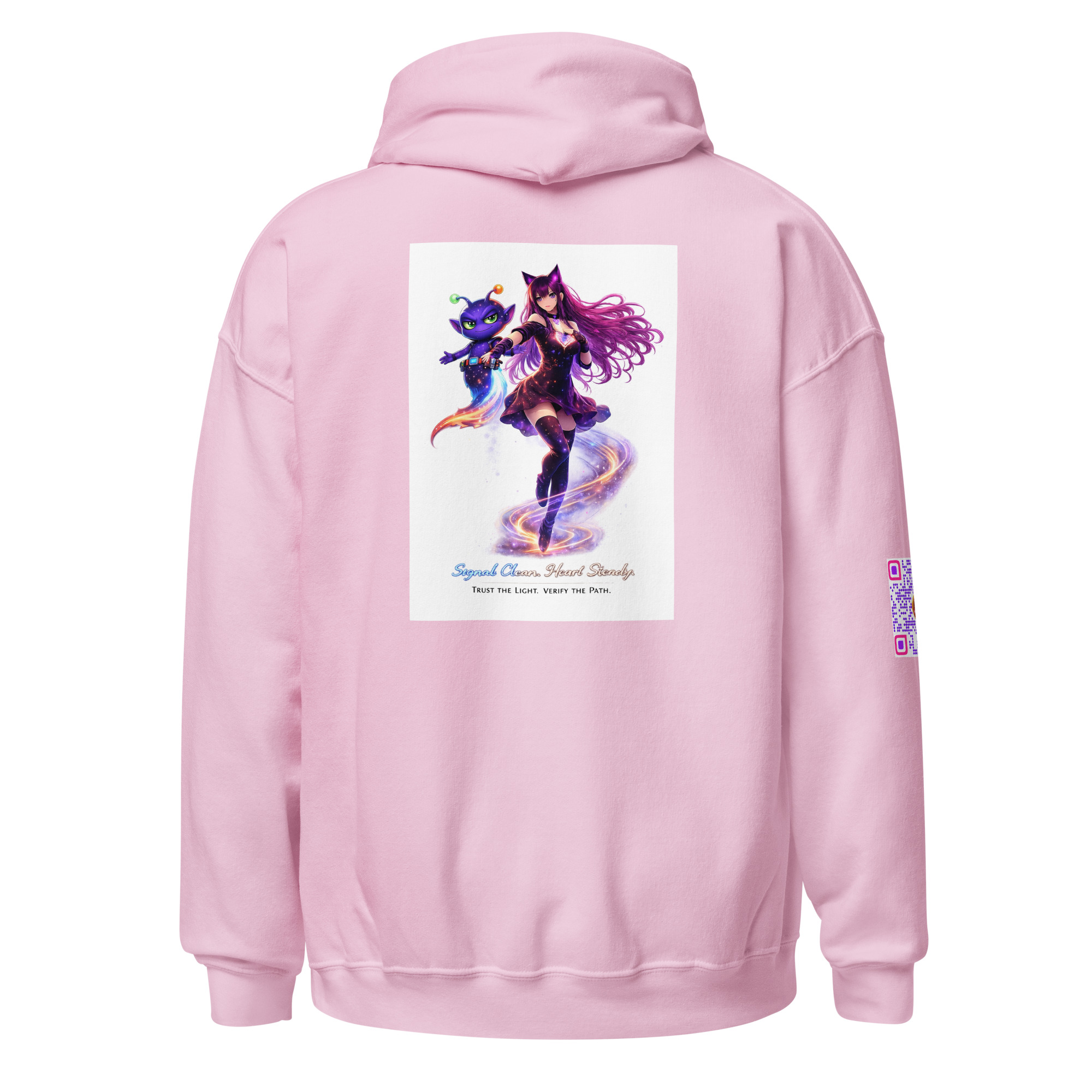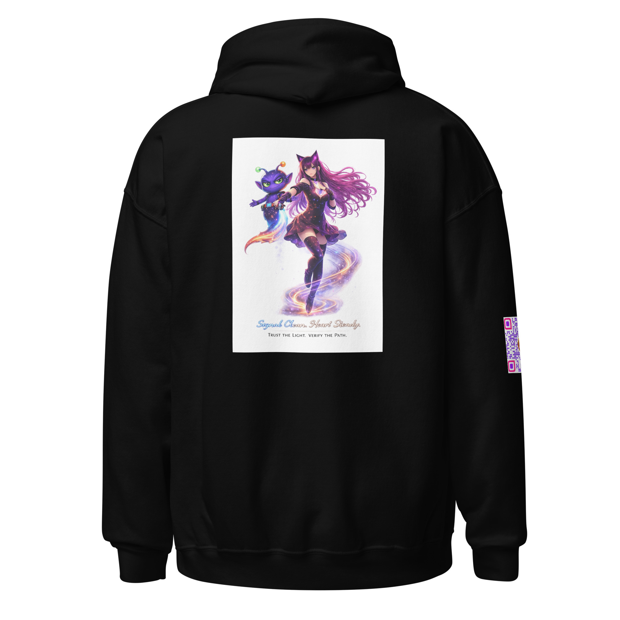 This shirt features the iconic duo in full motion—LumiNya cutting forward through swirling starlight, heart-core glowing with disciplined power, while Nebblip hovers at her flank with that unmistakable “I already ran the numbers” smirk.