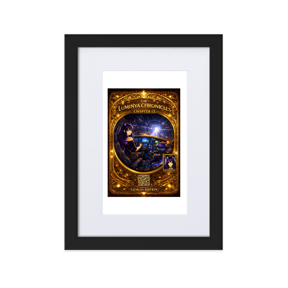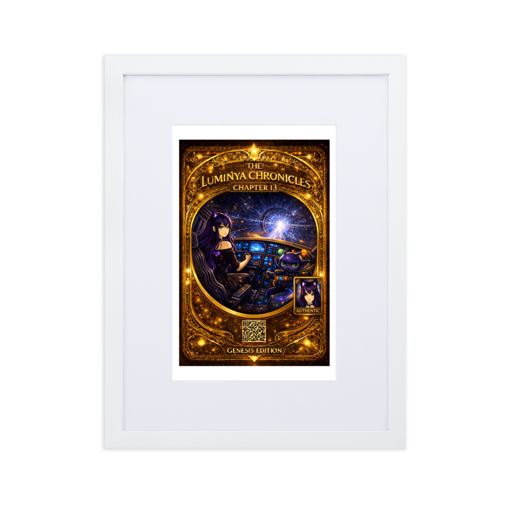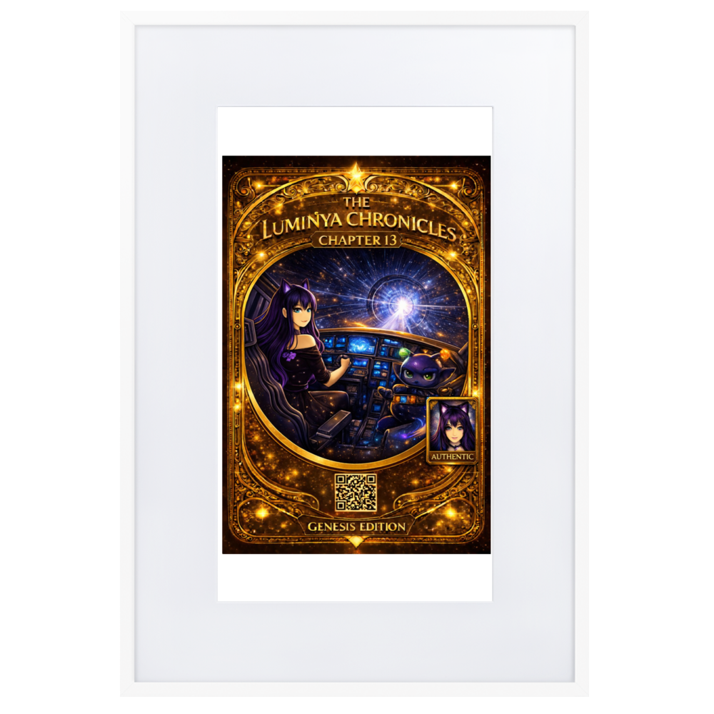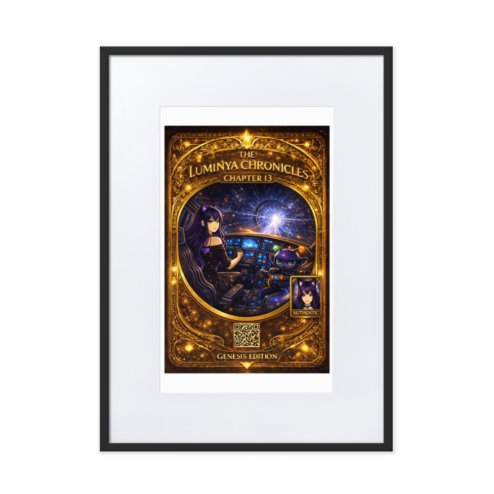 Chapter 13 captures the moment acceleration becomes intentional. LumiNya sits at the helm, poised and focused, hands steady on the controls as the cosmos bends into motion ahead. Nebblip, alert and calculating, monitors the systems beside her. Outside the cockpit, space stretches into a luminous tunnel of starlight — a warp corridor of pure forward momentum.